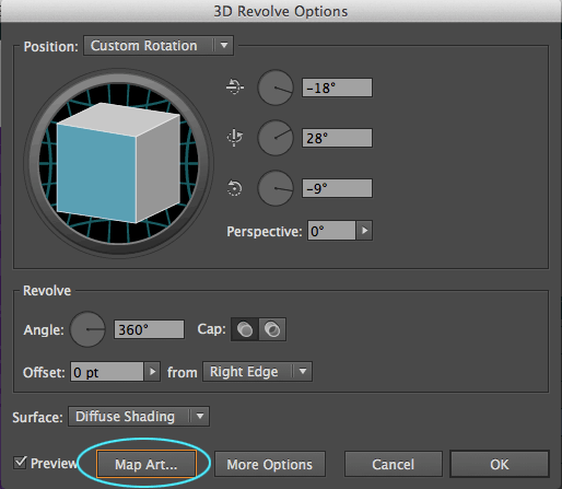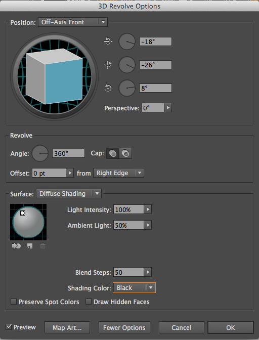 3. The 3D Revolve Options palette appears. Set yours to look like this: