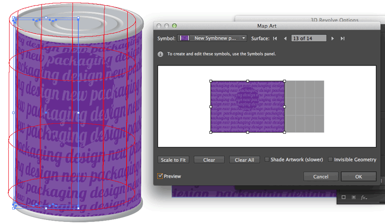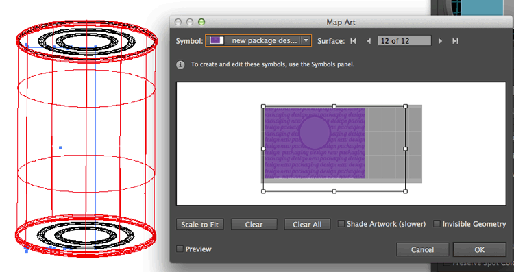 15. When this palette appears,select your new symbol, navigate to the surface you want to map it to, arrange your artwork on the page, and click preview to shee how it looks.